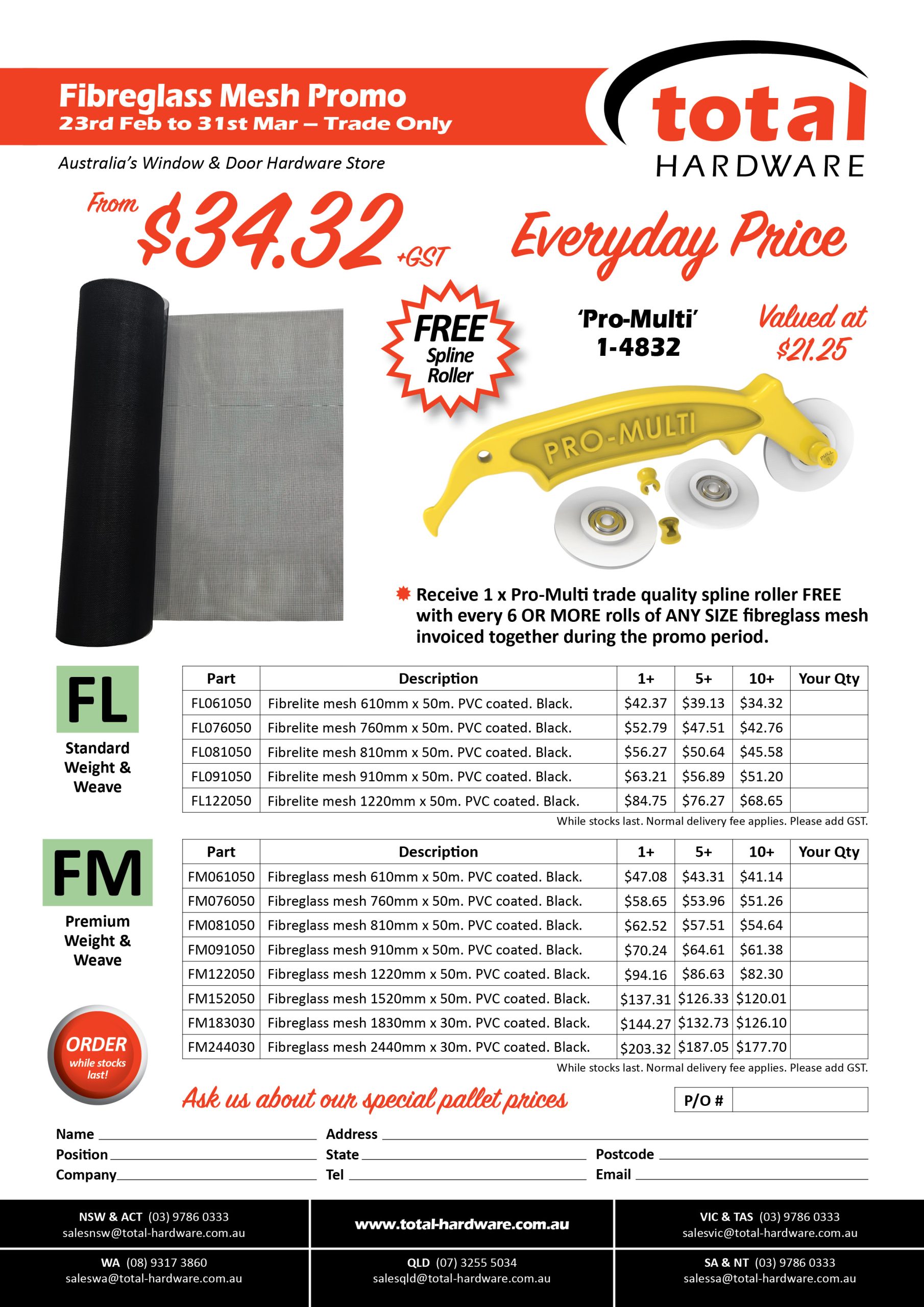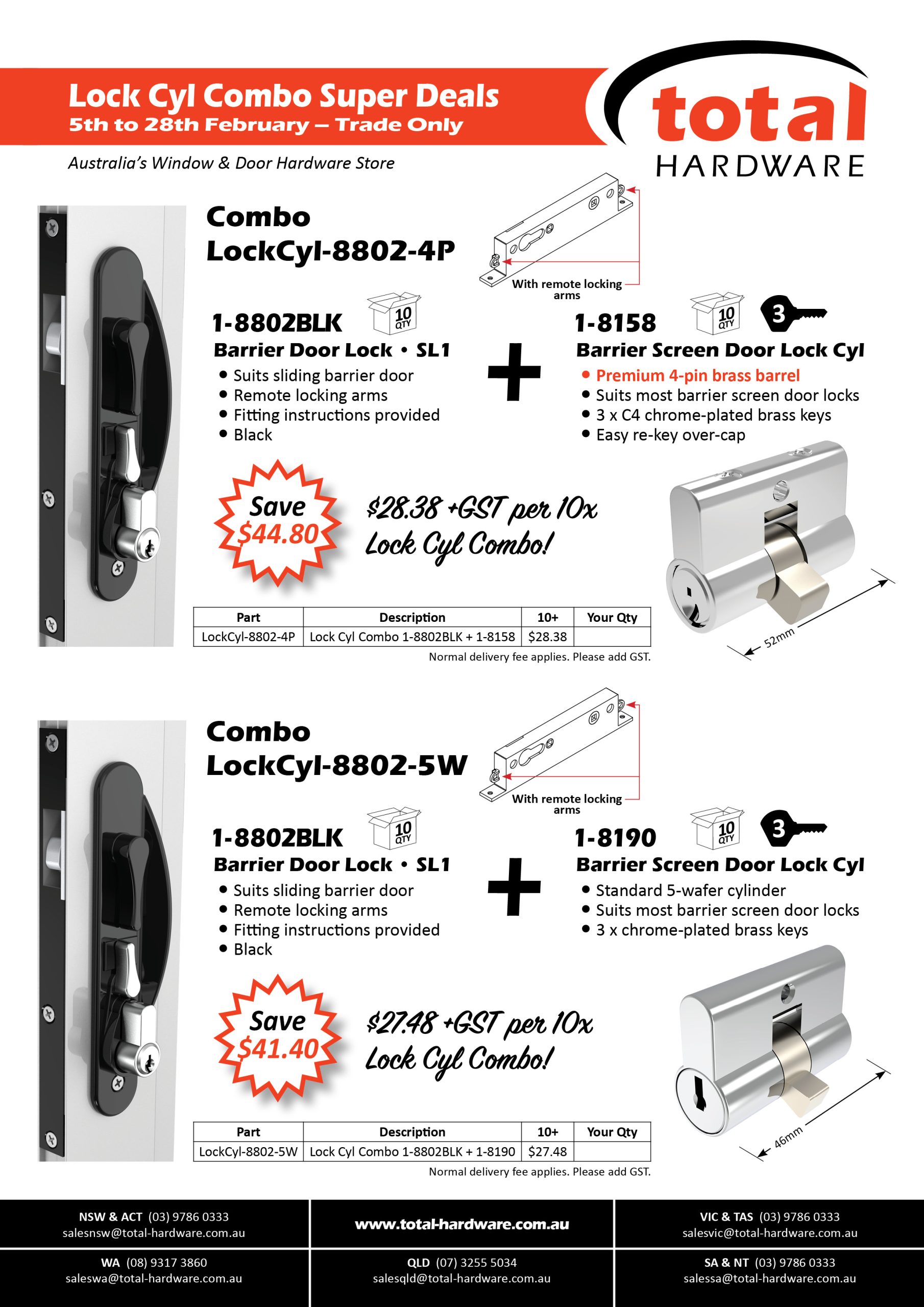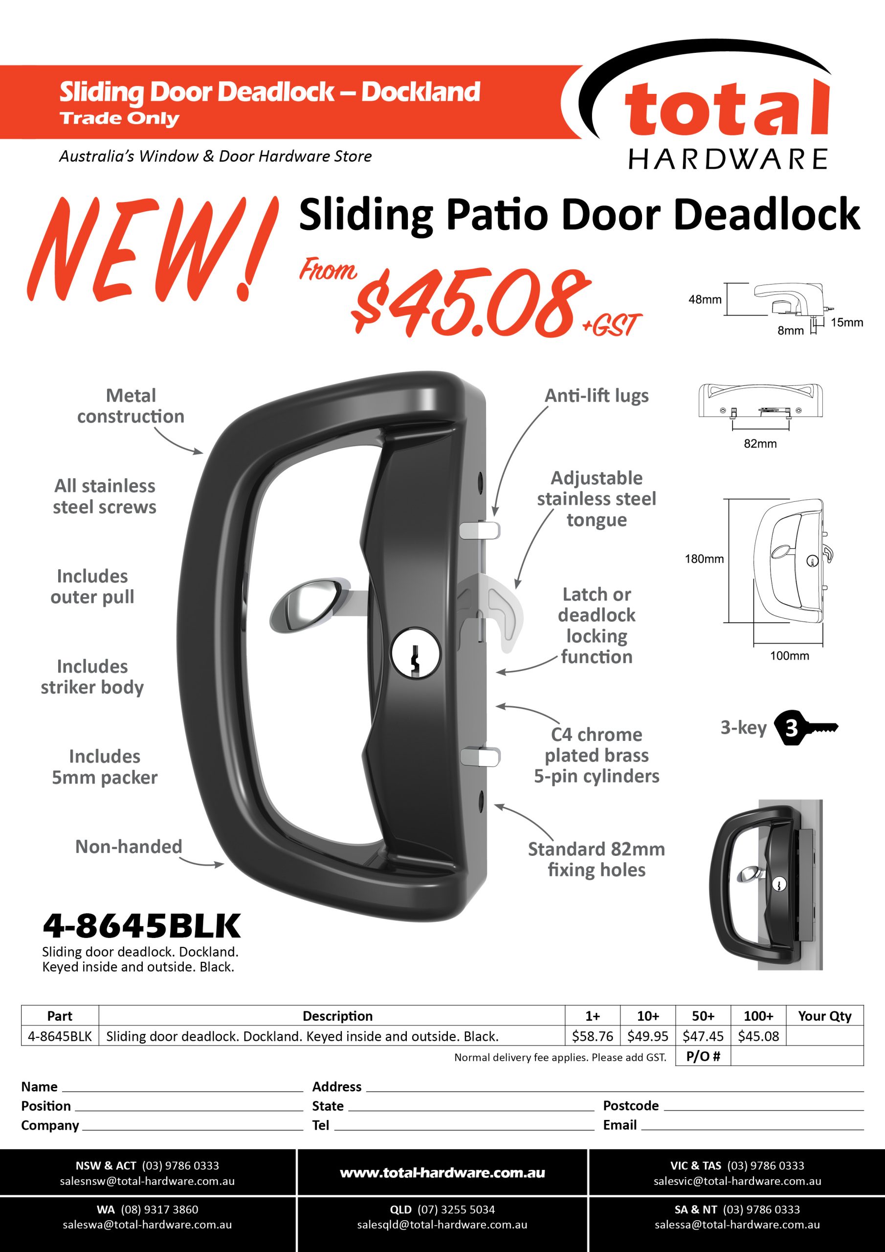Contact Total Hardware today, view our comprehensive on-line catalogue or request a hard copy catalogue from one of our representatives to view our extensive range of products and replacement parts that suits security doors, safety and barrier doors, flyscreen doors, sliding patio doors, residential windows and doors, hi-end residential, commercial and shopfront windows and doors, shower doors, mirrors and wardrobe doors.