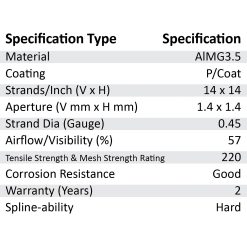 NOTE: Aluminium powder-coated mesh. Although AT has some corrosion resistance, it is not recommended for environmental applications beyond MILD. For corrosive environments, we recommend SR – 316 stainless steel mesh. Refer to our Insect Screen Warranty and Insect Screen & Sheet Applications & Maintenance brochures in the library section of our website for standard warranty, recommended environmental applications and essential maintenance.
